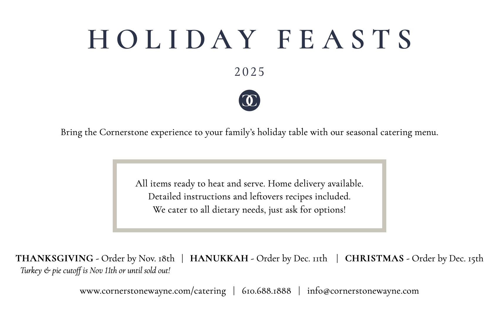 Call: 610-688-1888 or Email: info@cornerstonewayne.com to place your order today!